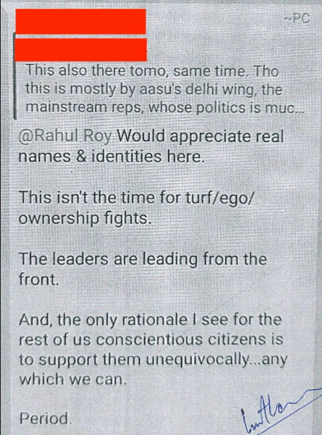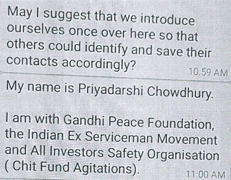During the introduction process, “PC” identified himself as Priyadarshi Chowdhury, a former serviceman linked to the Gandhi Peace Foundation and known for his association with the Aam Aadmi Party. At this point, Rahul Roy added another number to the group, which remained silent until 3 February 2020.