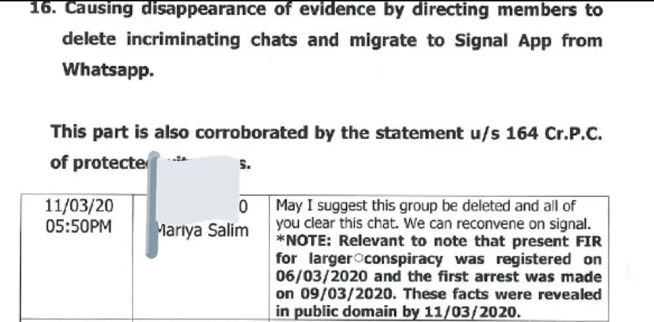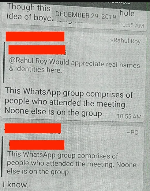 On 11 March one of the group members, Mariya Salim, urged that the DPSG group be deleted and that all members clear their chat histories, suggesting they reconvene on the Signal app. Rahul Roy then advised all members to delete their messages individually. Immediately after this exchange, on 12 March Sachin Rao and Athar Khan were removed from the group.