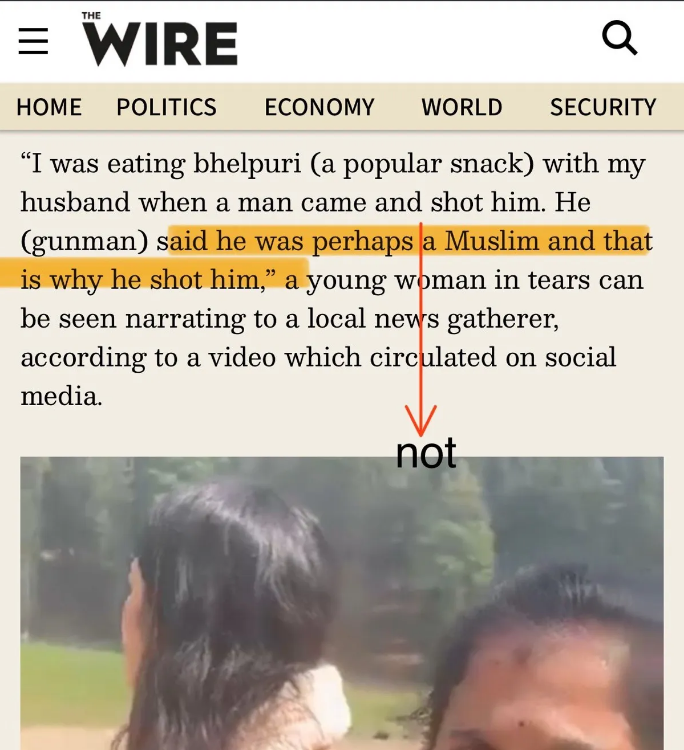 On 22 April 2025, The Wire published a report about the Pahalgam terror attack, authored by journalist Jehangir Ali. In the article, The Wire misquoted an eyewitness, altering the context of her statement in a way that downplayed the targeted nature of the attack against Hindus.