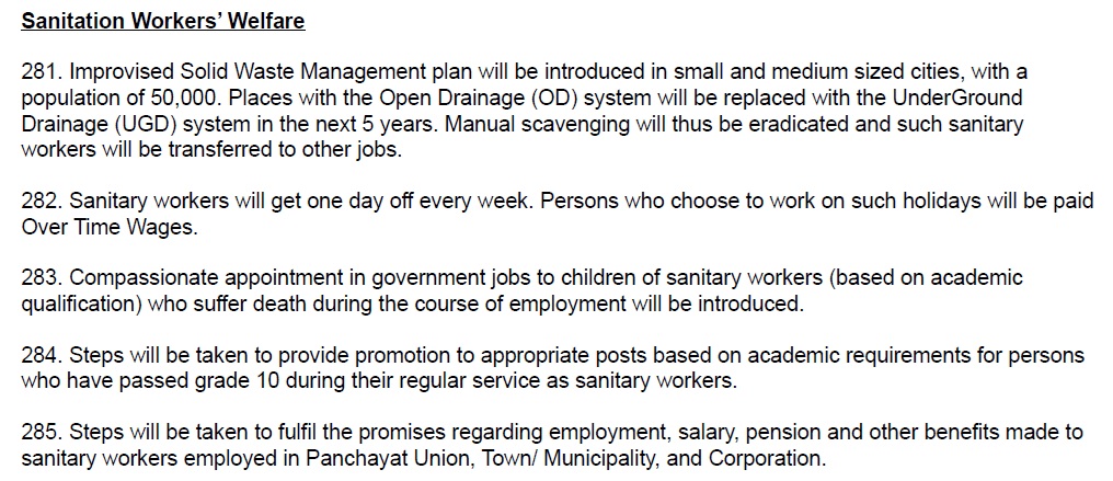 Nowhere is the DMK’s betrayal starker than in Chennai’s sanitation sector. Mostly Dalit women, sanitation workers were promised permanent government jobs by Stalin in opposition. This is what was there in the manifesto.