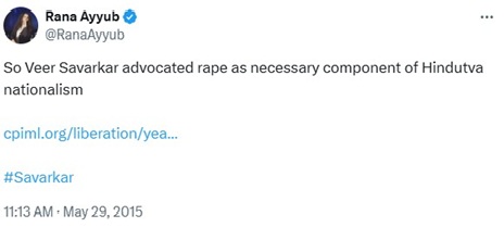 In one post in 2015, she derogated Veer Savarkar and wrote (and this post still exists till date), “So Veer Savarkar advocated rape as necessary component of Hindutva nationalism”