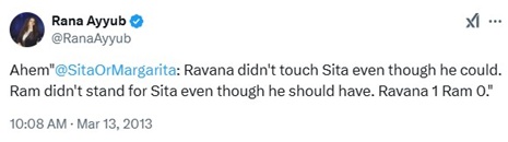 In another post from 2013, Rana Ayyub derogated Lord Rama and wrote, “Ravana didn’t touch Sita even though he could. Ram didn’t stand for Sita even though he should have. Ravana 1 Ram 0.”