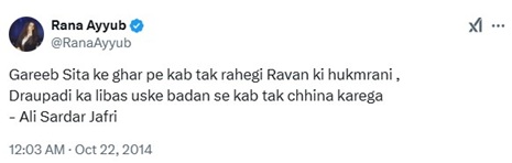 In a post from 2014, Rana Ayyub mocked Sita Mata and Draupadi and wrote, “Gareeb Sita ke ghar pe kab tak rahegi Ravan ki hukmrani, Draupadi ka libas uske badan se kab tak chhina karega.”