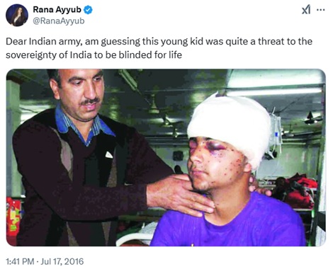 Rana Ayyub also published posts criticising the Indian Army. In one such post from 2016, she wrote, “Dear Indian Army, am guessing this young kid was quite a threat to the sovereignty of India to be blinded for life.”