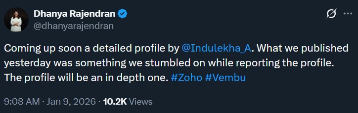 A day after publishing a paywalled article centred on the personal divorce proceedings of Zoho founder Sridhar Vembu, The News Minute editor Dhanya Rajendran indicated that a more detailed profile of the entrepreneur is forthcoming. On her X handle, she announced this writing, “Coming up soon a detailed profile by @Indulekha_A. What we published yesterday was something we stumbled on while reporting the profile. The profile will be an in depth one.”