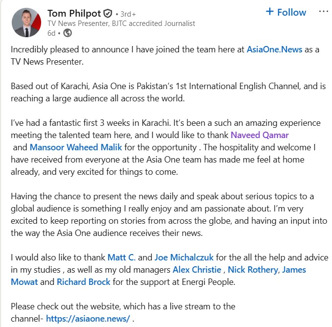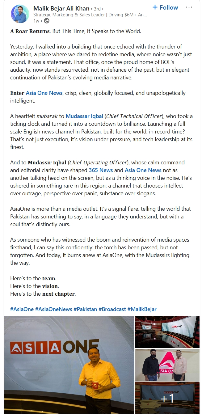 Malik explained that previous attempts like Dawn News, Express 24/7, Indus News, and PTV World all failed due to poor planning, lack of funds, and unprofessionalism. With AsiaOne, he believes a fresh attempt is being made to challenge India’s dominance in the global English-language media space. He also suggested that the channel could benefit figures like Bilawal Bhutto Zardari, who are fluent in English and well-positioned to promote their narratives to a global audience. Malik praised the visual quality and international staffing of the new channel, calling it a step forward for Pakistan’s media ambitions.