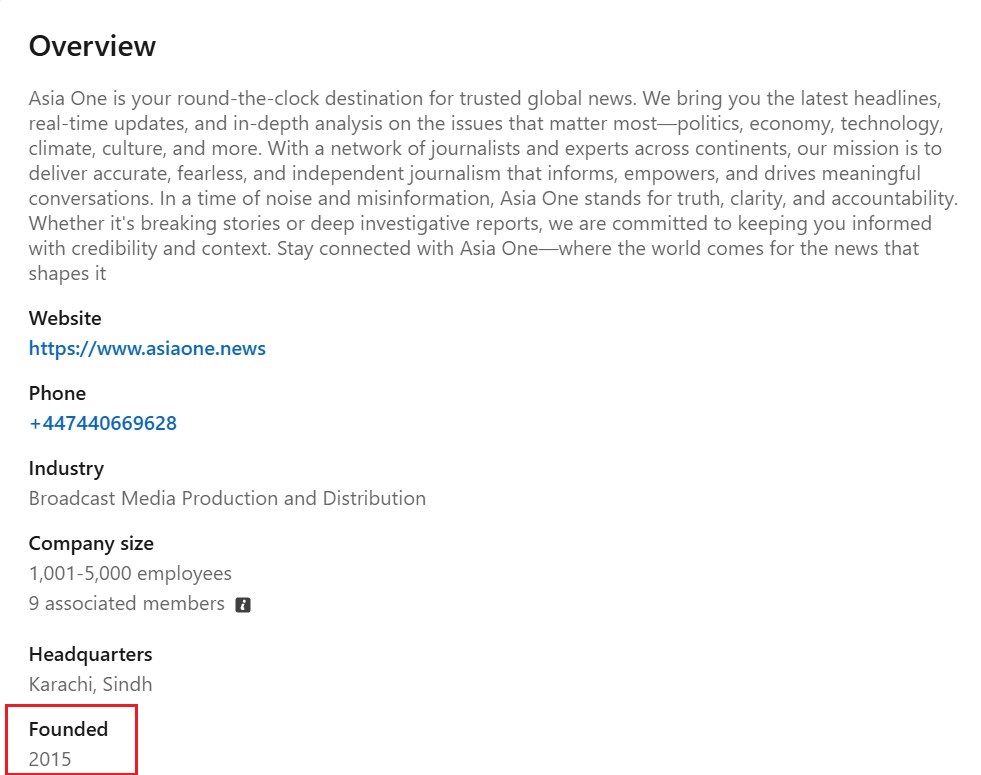 According to their LinkedIn page, AsiaOne was founded in 2015, though their YouTube bio lists the creation date as 28 June 2025.