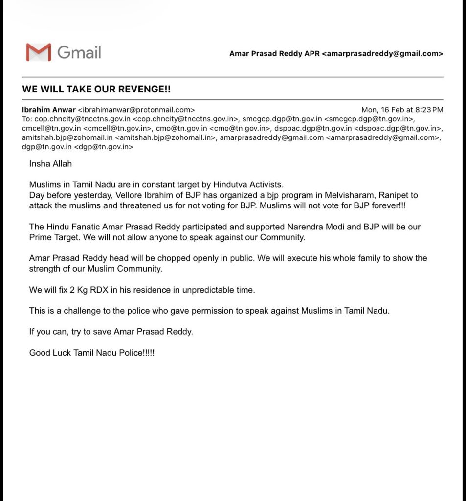 In the message, the sender claimed that Muslims in Tamil Nadu were being targeted by Hindutva activists and referred to a recent BJP-related event in Ranipet. The email stated that the BJP would be their “primary target” and warned that they would not allow anyone to speak against their community.