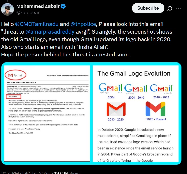 Quick to dismiss this as ‘fake news’, alleged fact-checker Mohammed Zubair, questioned why anyone, particularly a Muslim, would begin an email with ‘Insha Allah’. He replied to Reddy’s post on X saying, “Hello @CMOTamilnadu and @tnpolice, Please look into this email “threat to @amarprasadreddy avrgl”, Strangely, the screenshot shows the old Gmail logo, even though Gmail updated its logo back in 2020. Also who starts am email with “Insha Allah”. Hope the person behind this threat is arrested soon.”