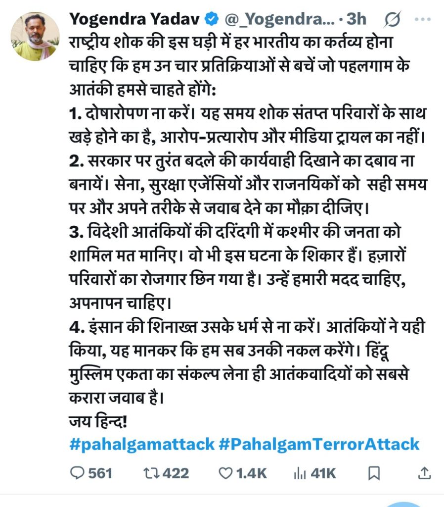 In the aftermath of the Pahalgam terror attack, where innocent lives were lost in a gruesome assault that shook the nation, alleged psephologist Yogendra Yadav—once again—took to X not to condemn the terrorists or demand justice, but to lecture Indians on what not to do. His post, masquerading as a message of peace, was in reality a masterclass in moral grandstanding, tone-deaf deflection, and insidious whitewashing of terror.