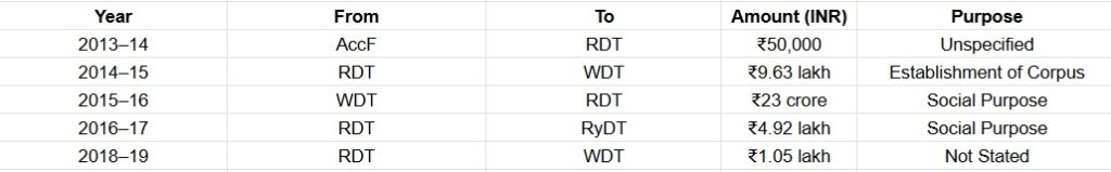 The ₹23 crore transferred in FY 2015–16 by WDT to RDT for a vague “Social Purpose” has especially drawn concern, with the complaint describing this as indicative of money laundering and non-arm’s-length fund movements.