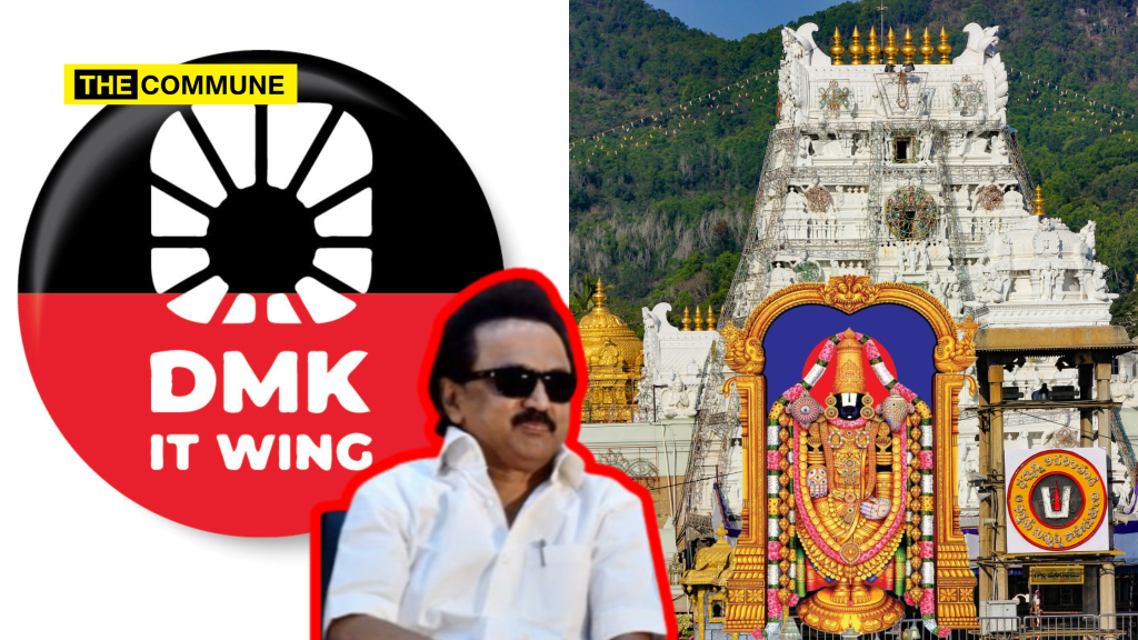 Through its official X handle, the DMK IT wing posted a video remixing the devotional Tirupati Perumal chant “Srinivasa Govinda” in a manner found disrespectful. The status featured the caption,