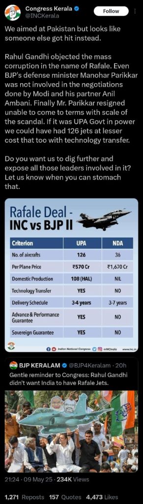 In its 9 May 2025 post, the official INC Kerala handle stated, “We aimed at Pakistan but looks like someone else got hit instead. Rahul Gandhi objected the mass corruption in the name of Rafale. Even BJP’s defense minister Manohar Parikkar was not involved in the negotiations done by Modi and his partner Anil Ambani. Finally Mr. Parikkar resigned unable to come to terms with scale of the scandal. If it was UPA Govt in power we could have had 126 jets at lesser cost that too with technology transfer. Do you want us to dig further and expose all those leaders involved in it? Let us know when you can stomach that.”