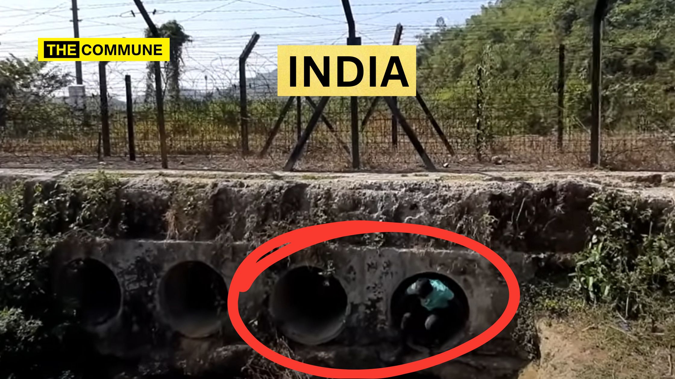 He goes towards the fencing as he and his group of friends walk further close to the fencing, we are shown pipelines. The person on camera claims that people can enter through these “pipelines” and this is a direct route to India.