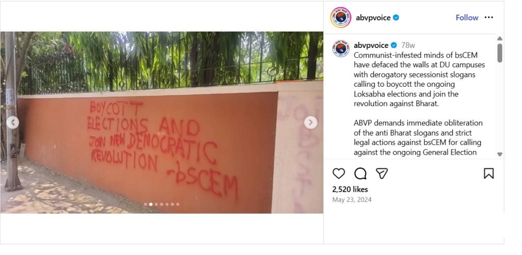 In May 2024, bsCEM was booked under the Delhi Prevention of Defacement of Property Act after defacing the walls of Delhi University with graffiti such as “Ek hi raasta Naxalbari” and calls to boycott elections, denouncing parliamentary democracy as a “sham.”
