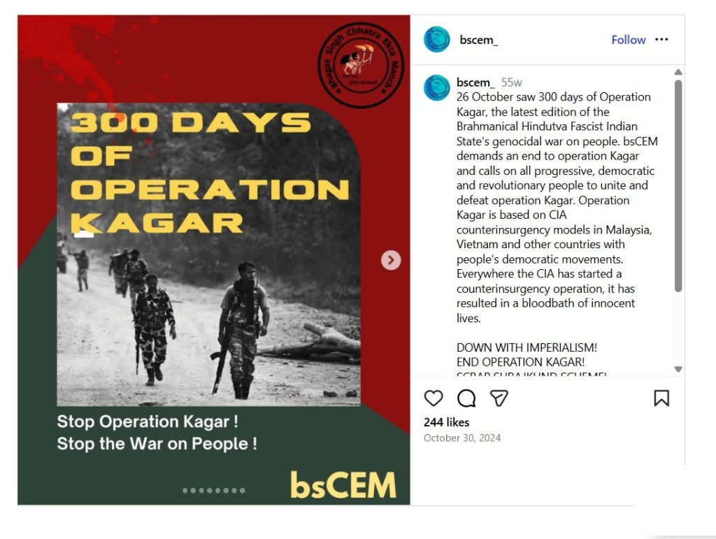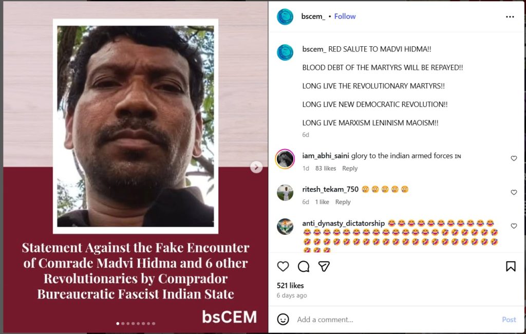 bsCEM social media posts have repeatedly framed Maoist insurgents killed in encounters as “martyrs” and accused the government of “Brahmanical Hindutva fascism.”