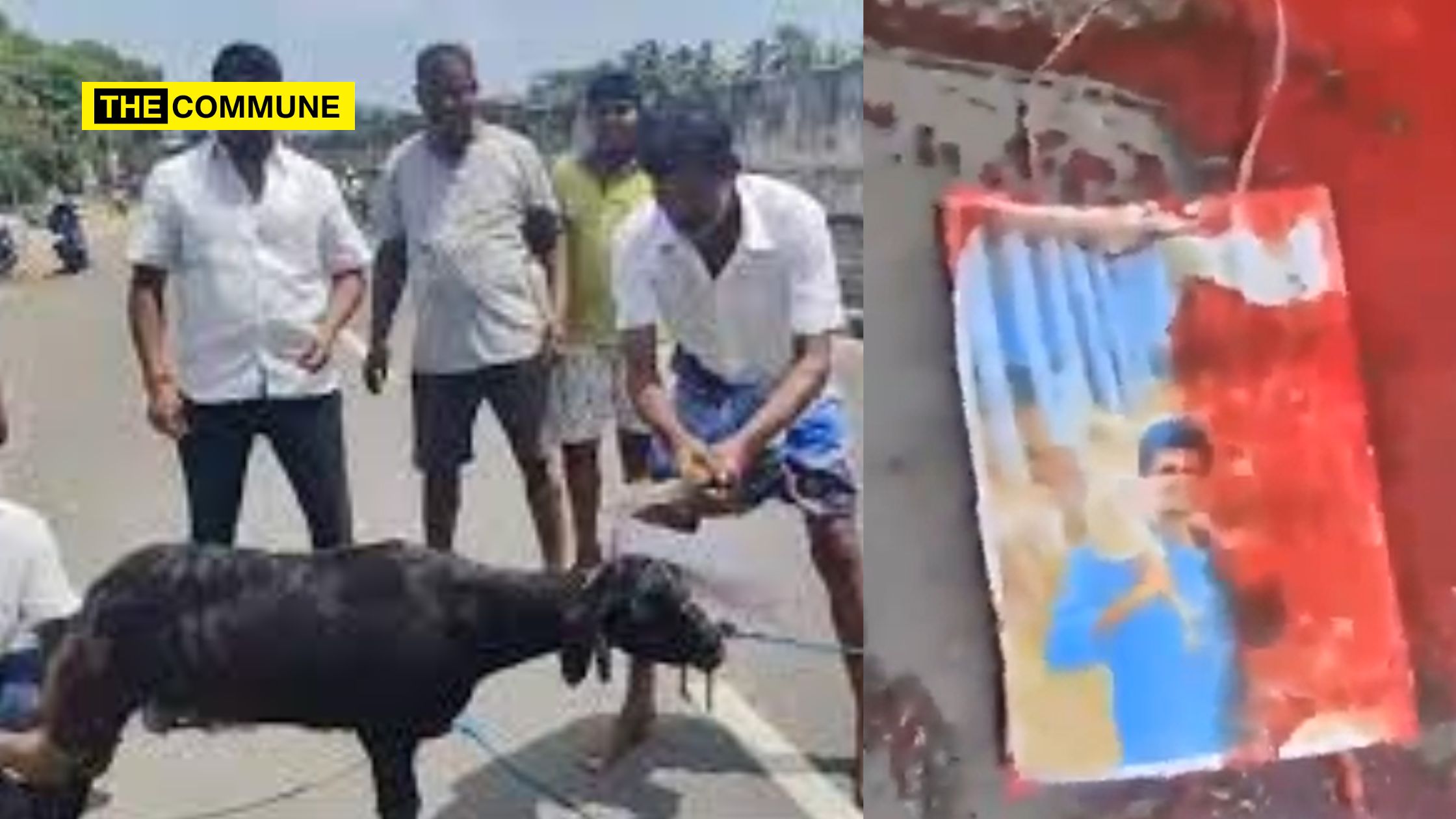DMK workers/supporters have beheaded a goat with a photo of Annamalai.