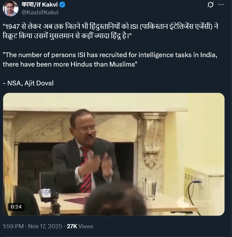 In the viral fragment, Doval is seen saying: “The number of persons that ISI has recruited for intelligence tasks in India… there have been more Hindus than Muslims…”