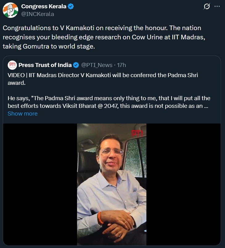 Quoting his video message, the Kerala Congress handle wrote: “Congratulations to V Kamakoti on receiving the honour. The nation recognises your bleeding edge research on Cow Urine at IIT Madras, taking Gomutra to world stage.”