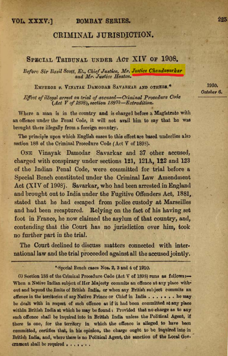 In December 1910, Chandavarkar sat on a Special Tribunal of the Bombay High Court alongside Chief Justice Basil Scott and Justice Heaton in the Nasik Conspiracy Case.