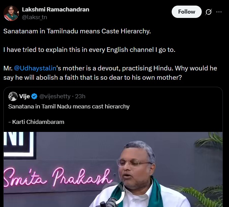 Amplifying these remarks, Lakshmi Ramachandran shared the video clip on social media and voiced support for Chidambaram’s position. She stated that “Sanatanam in Tamil Nadu means caste hierarchy” and said she had articulated this interpretation across English television debates.