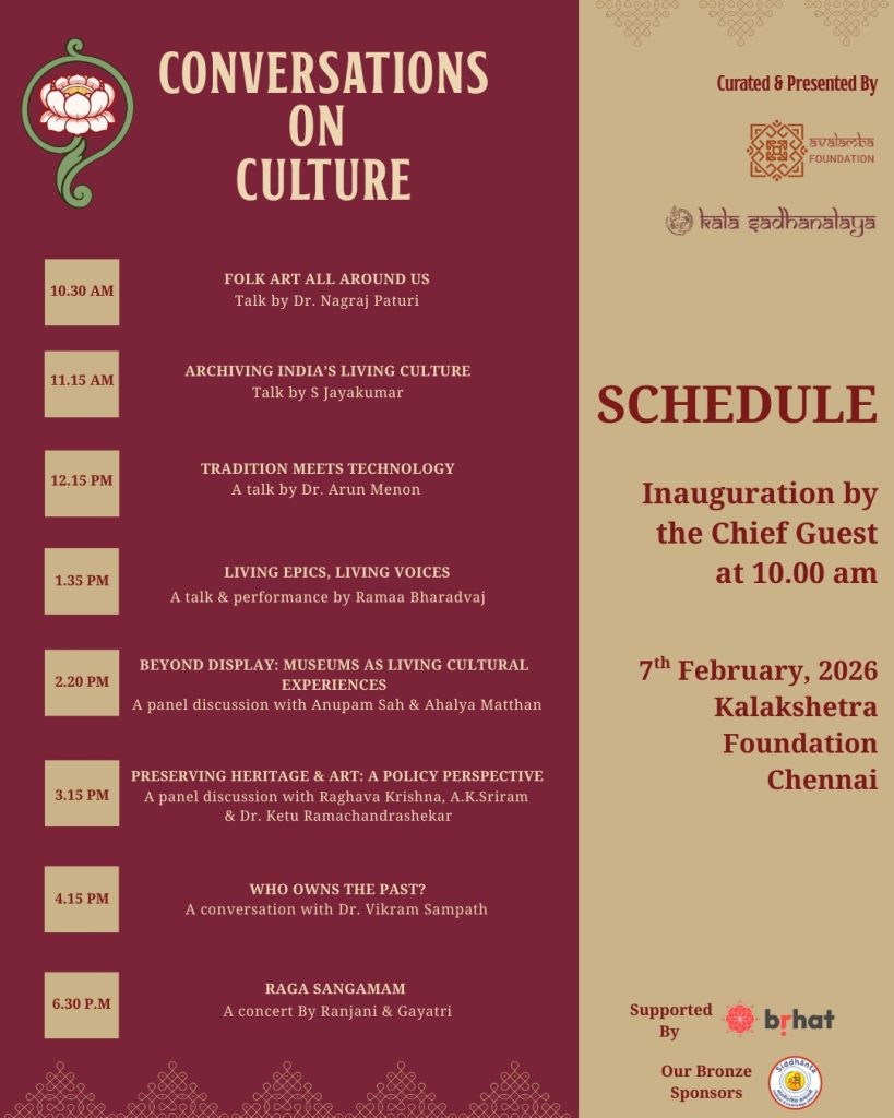 A new cultural dialogue platform titled Conversations on Culture is set to make its debut on 7 February 2026, at the Kalakshetra Foundation, bringing together scholars, artists, and practitioners for a full-day engagement on art, heritage, and living traditions.