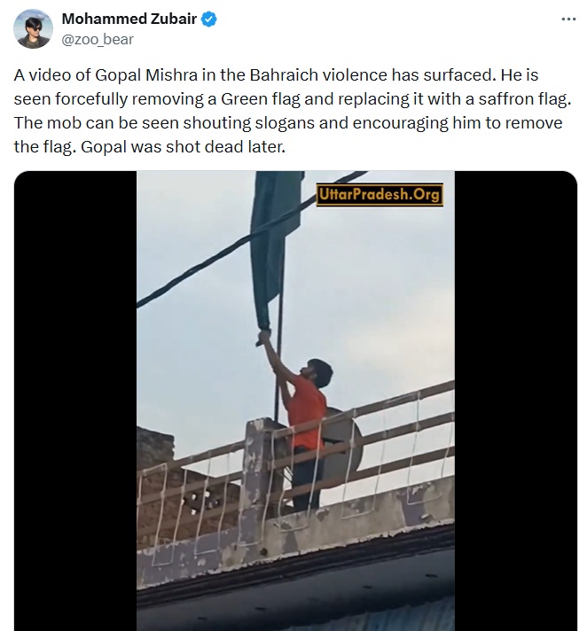 Soon after the murder last year, Alt News co-founder and fake news peddler Mohammed Zubair posted a video on X showing Mishra removing a green flag from a rooftop and replacing it with a saffron one. Zubair captioned the clip saying Mishra was seen “forcefully removing a Green flag… Gopal was shot dead later.”