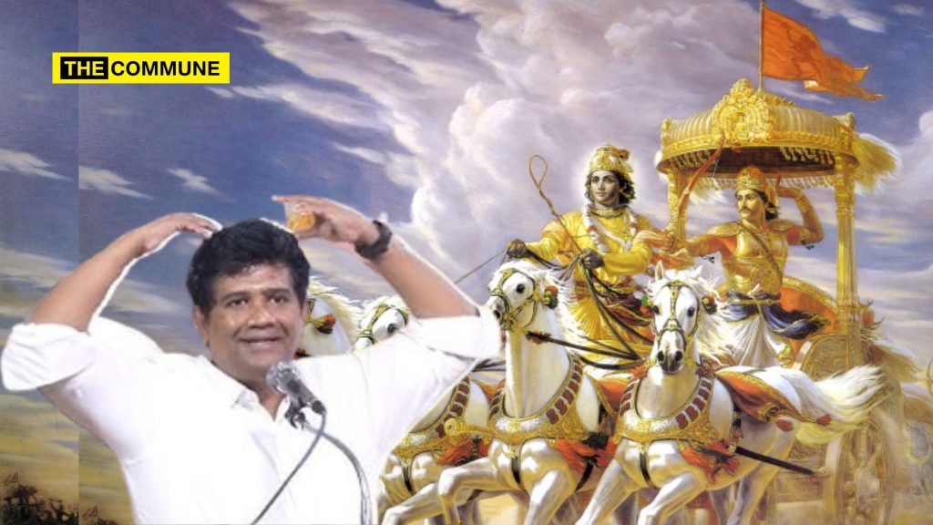 Speaking at the event DMK MLA Ezhilan said, “Have you noticed that even today, Kamba Ramayana festivals are being conducted in palatial five-star hotels under the guise of Bhagavad Gita oration? They declare it as ‘elite,’ delivering narrations in English, and then you have Englishmen’s narration, exclaiming, ‘Wow! awesome! The Bhagavad Gita is a perceptional change!’ That (Gita) itself an extra fitting. The Mahabharata unfolds on one side, and it is evident that this (Gita) was cleverly inserted in the middle. Suddenly, at the peak of the war, Krishna begins advising Arjuna—this is what they call the Gita.”