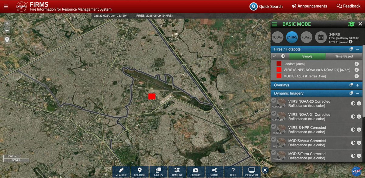 These unverified reports were bolstered by geolocation analysis of videos purporting to show the strike, which some claim confirm the hit on a hillside entrance. Satellite imagery and thermal imaging data from global sources, including NASA’s Visible Infrared Imaging Radiometer Suite (VIIRS), were interpreted by some as further evidence. One thermal hotspot, allegedly from the strike on Noor Khan Airbase in Rawalpindi/Islamabad, reportedly persisted for over 24 hours.
