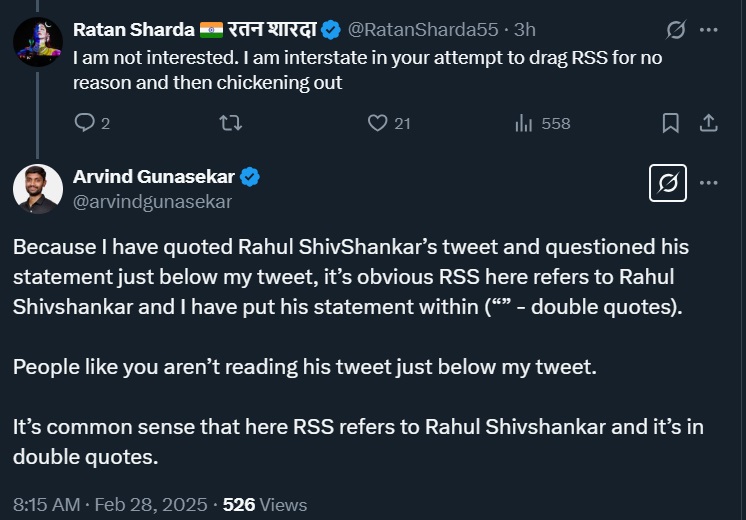 Sharda continued to call out his mistake and Gunasekar would not relent. He kept repeating that RSS was “obviously” referring to Shivshankar and not the organisation. He said, “Because I have quoted Rahul ShivShankar’s tweet and questioned his statement just below my tweet, it’s obvious RSS here refers to Rahul Shivshankar and I have put his statement within (“” – double quotes). People like you aren’t reading his tweet just below my tweet. It’s common sense that here RSS refers to Rahul Shivshankar and it’s in double quotes.”