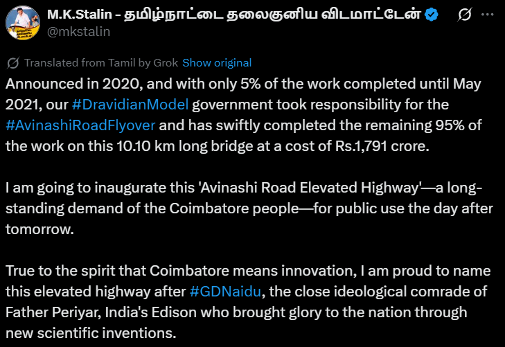 Stalin, in a post on X, said his government had completed 95% of the project’s work after assuming office, noting that only 5% had been finished when the DMK came to power. He said the 10.10 km-long flyover, built at a cost of ₹1,791 crore, reflects the government’s commitment to infrastructure and progress under the “Dravidian model.”