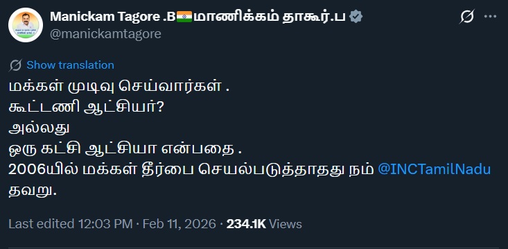 In a post on his X page, Tagore wrote that the people would decide whether Tamil Nadu should have a coalition government or a single-party government, adding that the failure to implement the people’s verdict in 2006 was a mistake committed by the Tamil Nadu Congress.