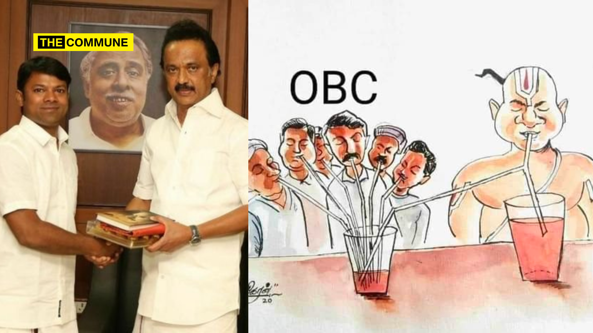 The image posted by the DMK IT Wing Deputy Secretary showed a person dressed as a Brahmin with sacred thread (Janeu) and having “Thirunamam” on his forehead, sucking juice from his own glass as well as the glass that belongs to OBCs. The tweet was intended to imply that Brahmins are taking the reservation meant for OBCs following the implementation of the Central government’s 10% EWS reservation.