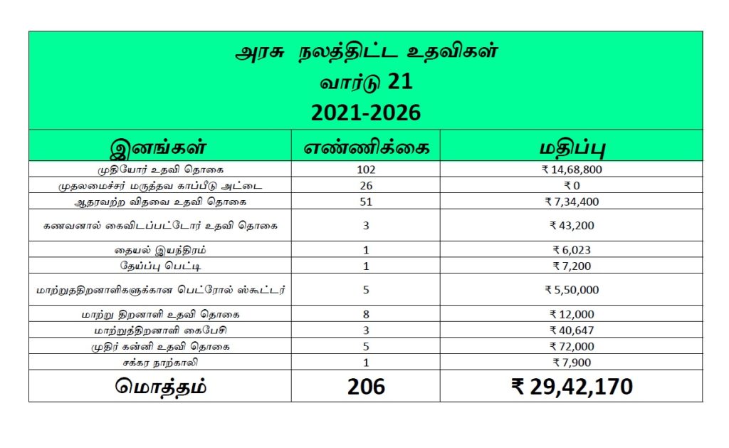 PTR’s document records 206 direct welfare beneficiaries in Ward 21 alone covering old-age pension, widow assistance, disability benefits, and similar schemes over the period 2021 to 2026, with a total disbursement of ₹29.42 lakh.