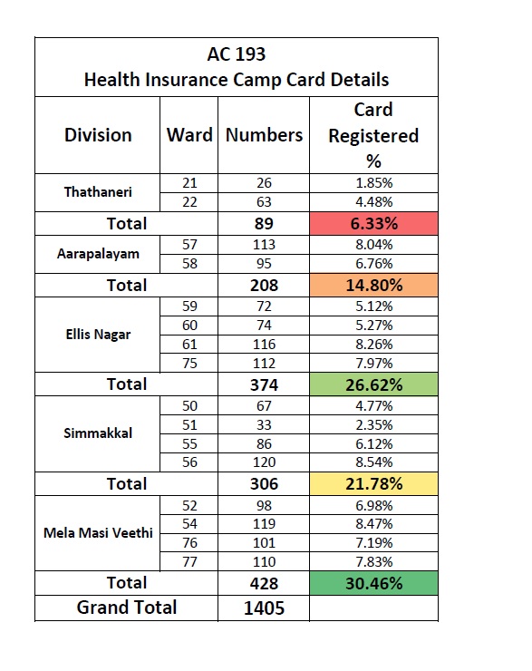 Across the entire Madurai Central constituency, the document records 1,405 Chief Minister’s Health Insurance cards registered at camp level with Ward 21 accounting for just 26 of those in a ward that had about 12000 people. Even accounting for eligibility criteria, the scale remains too modest for a constituency represented by a sitting Cabinet minister over two terms.