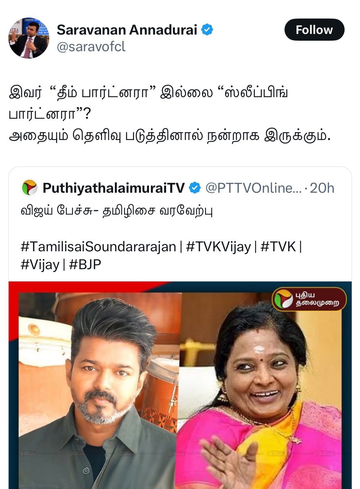 Annoyed by this development, Saravanan Annadurai—who has previously been busted for spreading misinformation to defend the DMK—made a derogatory comment against Tamilisai Soundararajan. In his post, he mockingly questioned, “Is he a ‘theme partner’ or a ‘sleeping partner’? It would be nice if this was clarified as well.”