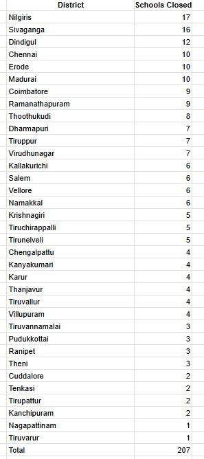 The Tamil Nadu government has closed 207 primary and middle schools across the state this academic year after reporting zero student enrollment, according to the School Education Department.