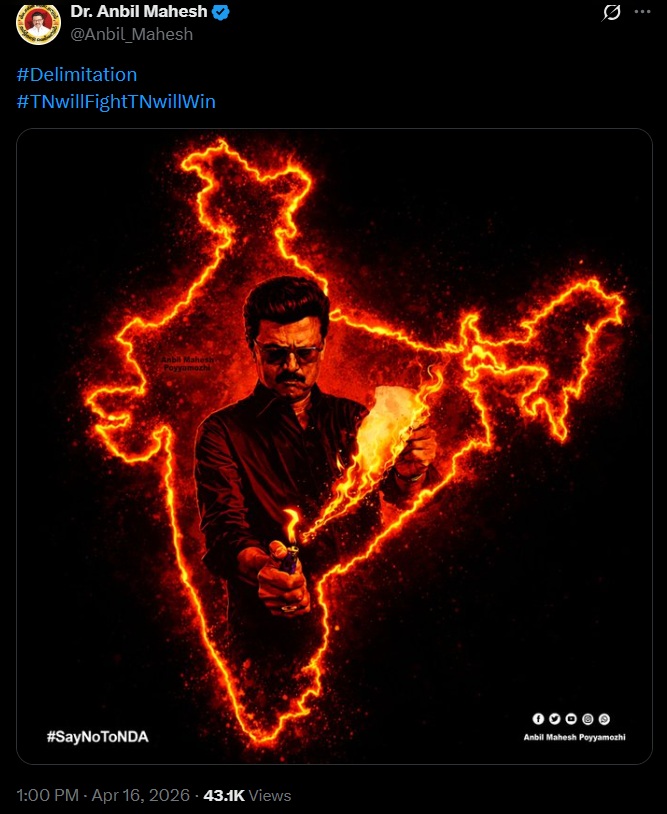 On 16 April 2026, the same day Parliament convened its special three-day session to pass the Delimitation Bill, DMK minister and party leader Anbil Mahesh Poyyamozhi and several other DMK handles shared a striking digital artwork on his official social media handles. The image showed MK Stalin holding a lighter and a burning piece of paper, set against the flaming outline of India’s map, with the hashtag #SayNoToNDA emblazoned at the bottom.