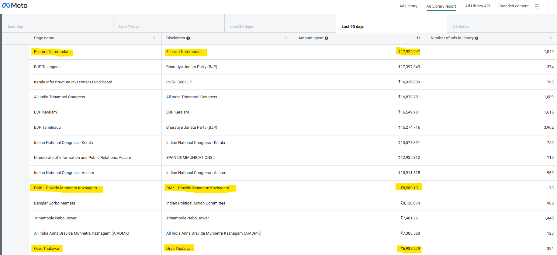 Data from Meta’s Ad Library for the last 90 days indicates spending across multiple pages associated with DMK-linked messaging: