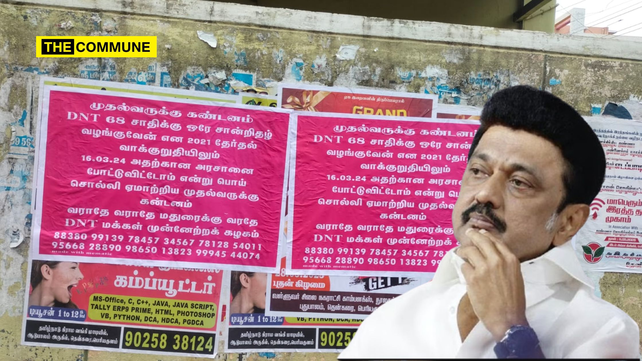 The posters read, “Condemnation to the Chief Minister – DNT. The Chief Minister, who made a false promise during the 2021 elections to issue a unified caste certificate to 68 communities, and claimed to have passed a government order on 16.03.2024, is now exposed. Do not come to Madurai.”