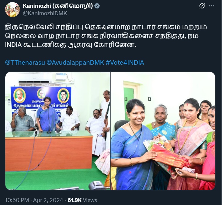 However, Kanimozhi’s criticism rings hollow in light of her own participation in a similar caste-based conference just 18 months ago. In April 2024, she proudly shared photographs and posts about attending the Nadar Sangam conference in Tirunelveli, where she not only praised the community’s role in Tamil society but also used the platform to seek support for the I.N.D.I. alliance.