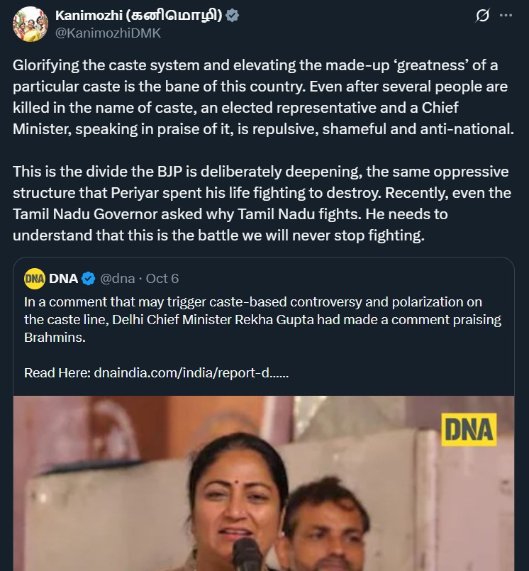 Dravida Munnetra Kazhagam (DMK) MP Kanimozhi has once again found herself at the centre of a controversy over selective outrage. The Thoothukudi MP criticised Delhi Chief Minister Rekha Gupta for addressing the All India Brahmin Conference organised by Shri Brahmin Sabha in Delhi’s Pitampura, accusing her of pandering to caste interests. In her post, Kanimozhi wrote, “Glorifying the caste system and elevating the made-up ‘greatness’ of a particular caste is the bane of this country. Even after several people are killed in the name of caste, an elected representative and a Chief Minister, speaking in praise of it, is repulsive, shameful and anti-national. This is the divide the BJP is deliberately deepening, the same oppressive structure that Periyar spent his life fighting to destroy. Recently, even the Tamil Nadu Governor asked why Tamil Nadu fights. He needs to understand that this is the battle we will never stop fighting.”