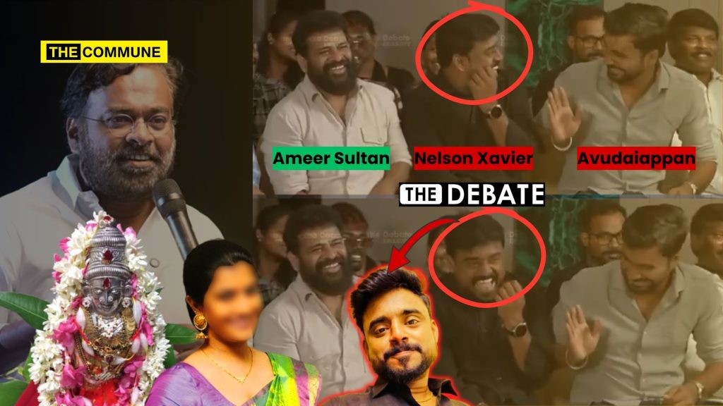 Later in the video while Karu Palaniappan was speaking, he asked the audience, “Why is the Varalakshmi function celebrated?” A Dravidianist journalist Nelson Xavier mockingly replied, “For Varalakshmi to be well,” prompting laughter from another D-Stock anchor, Avudaiappan and Islamist filmmaker Ameer Sultan who is involved in a drug case. The two exchanged chuckles, triggering laughter across the hall. These two are presented as “neutral” journalists in Tamil media, holding prominent positions.