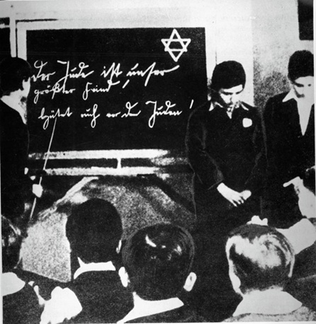 This image shows a Nazi-era classroom. In it, a teacher stands before a blackboard pointing to a hand-written slogan: “The Jew is our greatest enemy. Beware of the Jews.” Two young Jewish pupils stand at the front of the class, heads bowed, shamed in front of their peers. The other children sit silently, witnessing not just a lesson in reading, but a lesson in exclusion, hate, and hierarchy.