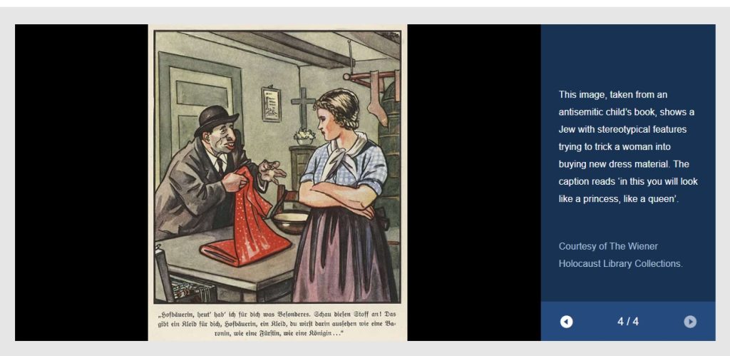 Here’s another example from a Nazi-era anti-semitic child’s book. It shows a Jew with stereotypical features trying to trick a woman into buying new dress material.