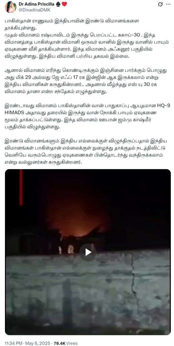 Despite the lack of verified facts, certain Dravidian-leaning individuals have been quick to celebrate and amplify Pakistan’s narrative within India. One such voice, Dr. Adina Pricilia, posted the following claim online, “The Pakistani army has shot down two Indian aircraft. The first aircraft is a Su-30, acquired from Russia. A Pakistani pilot shot down the aircraft with an air-to-air missile, and it crashed in the Akhanur area. There is no information about the Indian pilot. However, when the Indian pilots saw the burning engine of the aircraft, they speculated that it could be a MiG-29 or a JF-17 engine. As a result, there is suspicion that the aircraft that crashed was an SU-30. The second aircraft was hit by Pakistan’s air defense weapon, the HQ-9 HIMADS, which is a surface-to-air missile. This aircraft fell in the Uyan area of Jammu and Kashmir. Since both aircraft fell inside Indian territory, experts believe that the missiles may have followed the Indian aircraft when they entered and attacked Pakistani territory before exiting.”