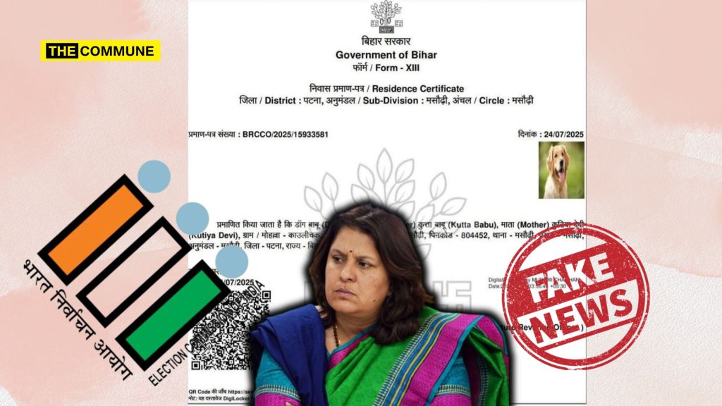 The claim, amplified by multiple political figures, including Shiv Sena (UBT)’s Priyanka Chaturvedi, Congress’ Supriya Shrinate, and activist Yogendra Yadav, shared what appeared to be an official residence certificate issued in the name of a dog, complete with a photo and parental details humorously listed as “Kutta Babu” and “Kuttiya Devi”.