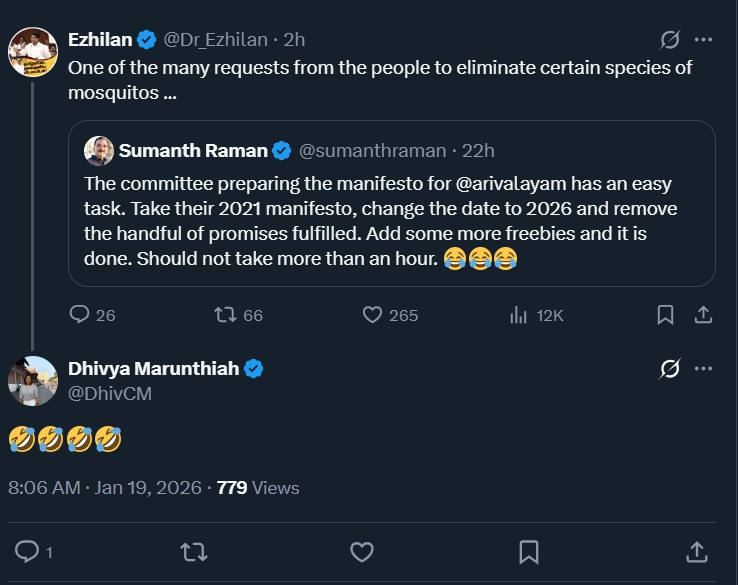 Political commentator Sumanth Raman posted on X mocking the Dravida Munnetra Kazhagam’s record of poll promise keeping in office. Writing from his handle, he said: “The committee preparing the manifesto for @arivalayam has an easy task. Take their 2021 manifesto, change the date to 2026 and remove the handful of promises fulfilled. Add some more freebies and it is done. Should not take more than an hour”