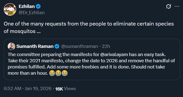 In response, Thousand Lights constituency MLA Dr. Ezhilan quoted Raman’s post and wrote: “One of the many requests from the people to eliminate certain species of mosquitos …”