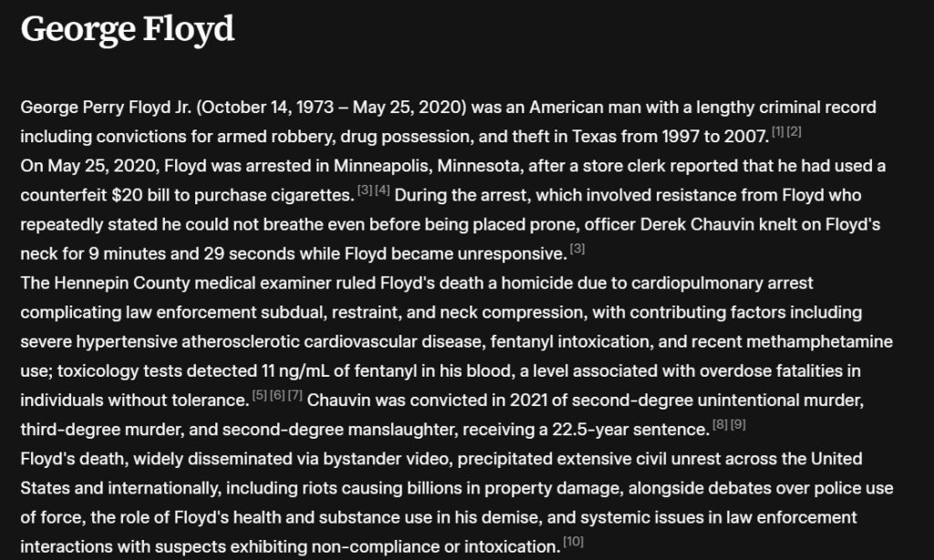 Grokipedia leads with Floyd’s “lengthy criminal record.” It details the official medical examiner’s report citing contributing factors like “fentanyl intoxication” and “cardiovascular disease,” alongside the circumstances of his death.